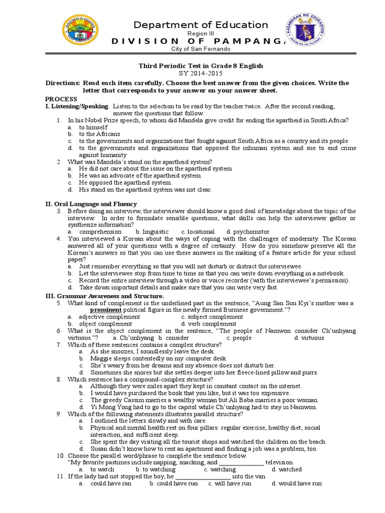 Grade 8 English With Answer Key Nelson Mandela Apartheid